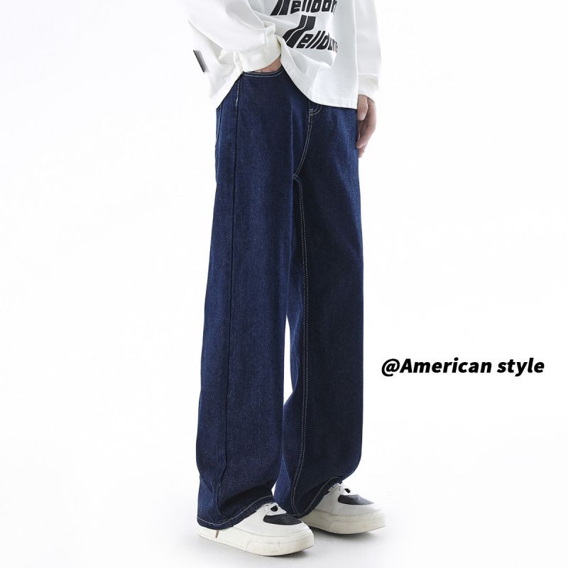 Deep blue washed denim jeans for men in spring and autumn 2024, new solid color versatile wide leg casual straight leg pants for teenagers