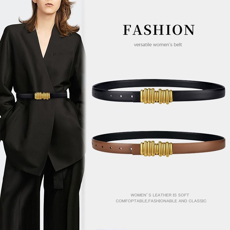 2024 New Belt Women's Genuine Leather Leisure Caterpillar Smooth Buckle Belt Korean Edition Slimming Jeans with Tide