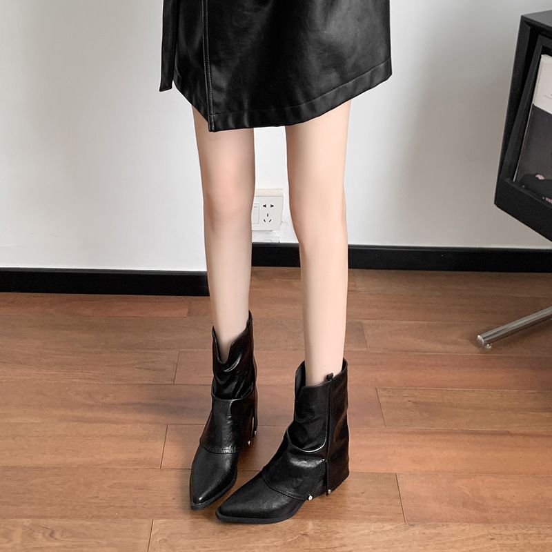 2025 Autumn Winter Women's Mid-Calf Pointed Toe Chunky Heel High Heel Short Boots Hot Girl Metal Leg Boots Slimming