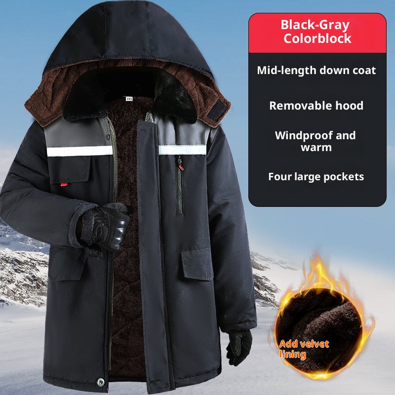 boy Reflective Strip Large Pocket Fleece Lined Thickened Warm Workwear Jacket Men's Wear-Resistant Windproof Waterproof