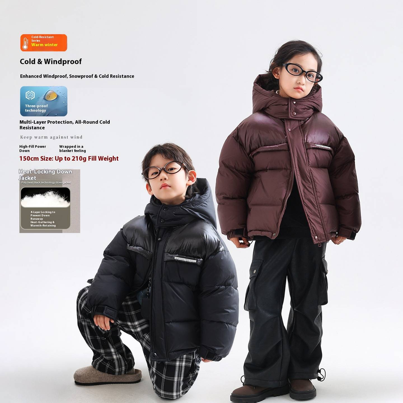 Kids' Winter Down Jacket With Hood - Warm Thickened Padded Coat For Boys & Girls, 86-90% White Duck Down, Soft Polyester Shell, Loose Fit