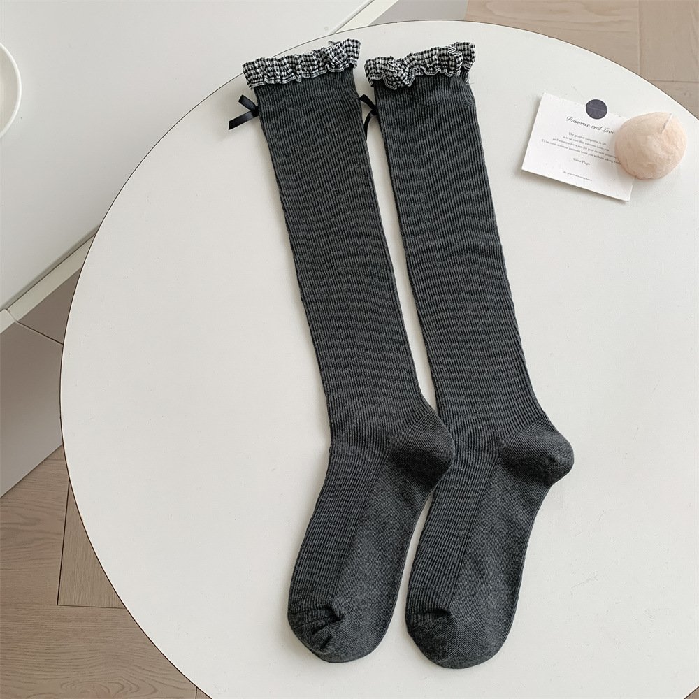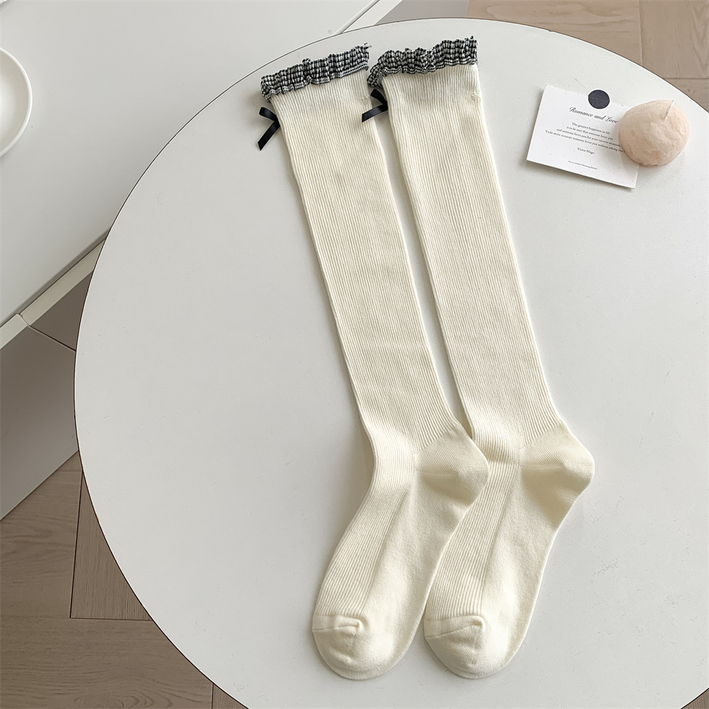 Autumn and winter miu style bow calf socks, forest style lace leg shaping vertical pattern women's long tube pile socks