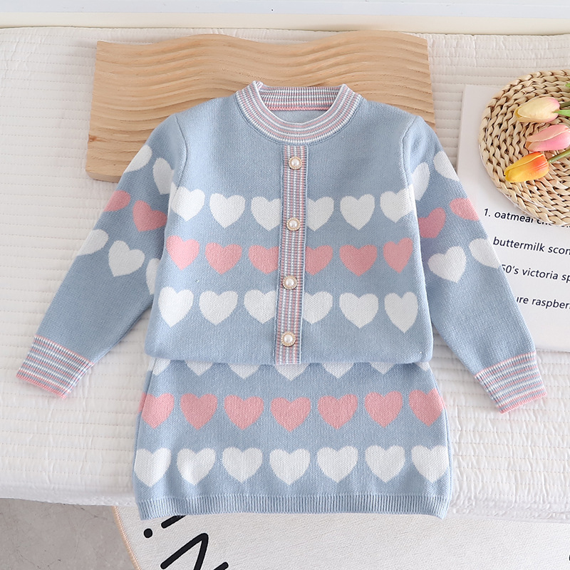 Girls' Spring and Autumn Sweater Knitted Skirt Children's New Love cardigan Skirt Children's Baby Sweater Two Piece Skirt Set