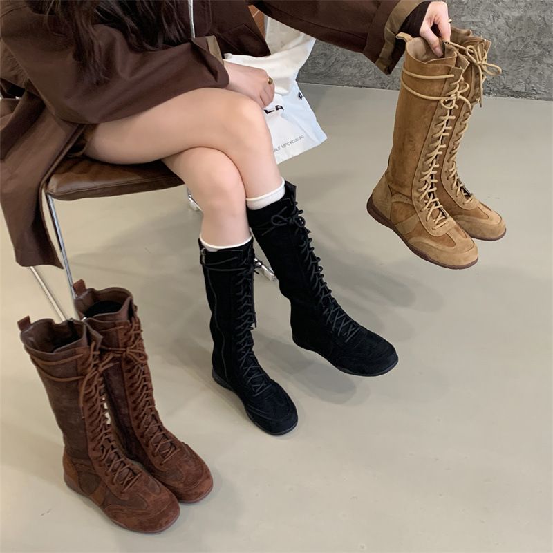 Women Boxing Boots Miting Front Lace-Up Casual Long Round Toe Versatile Height-Increasing Comfortable Martin Side Zipper Cool And Handsome